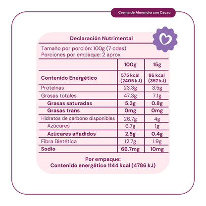 Nuestra crema de almendra con cacao, te aporta todos los nutrientes de la almendra y te da ese delicioso sabor a cacao. 100% natural y sin conservadores, es ideal para tus desayunos, snacks y acompañarlo con algunas frutas.